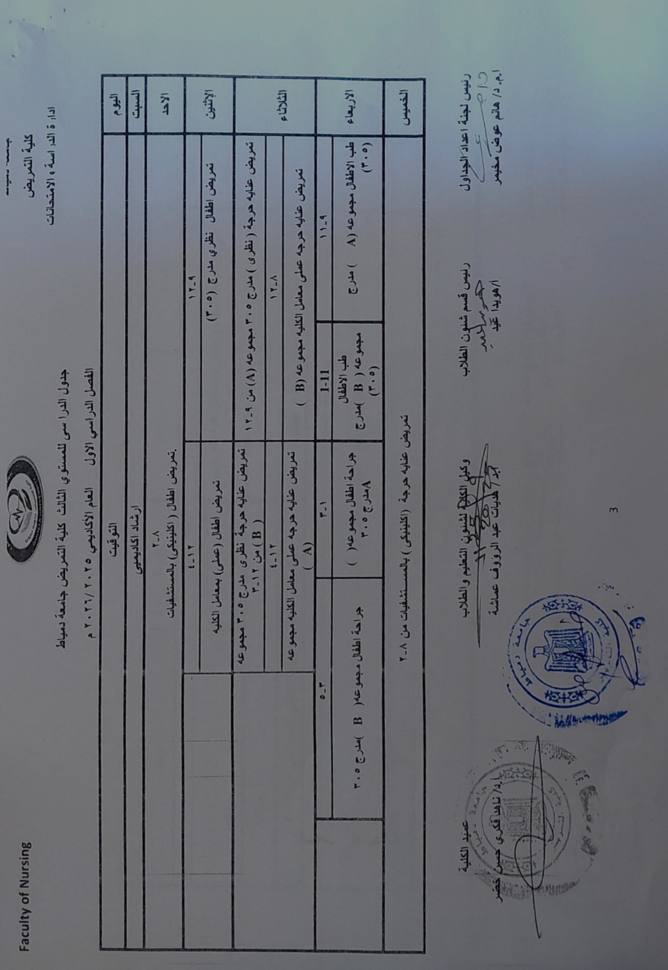 الجدول الدراسي لطلاب المستوي الثالث الفصل الدراسي الاول للعام الأكاديمي 2025/ 2026 م
